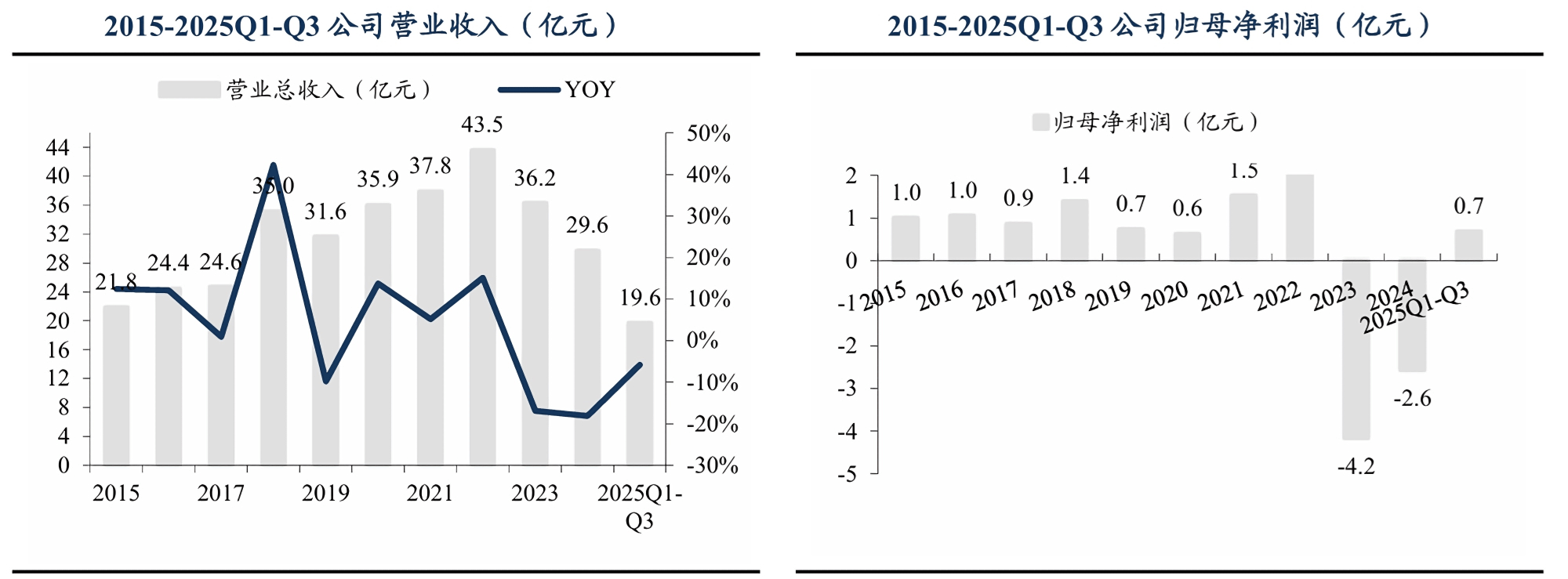 除了这些行业层面的挑和,公司本身业绩也面对短期波动压力。从营收走势来看,2017-2024年公司营收全体呈现“先波动上升后下滑”的态势:2017-2022年是不变增加期,营收从24。58亿元稳步攀升至43。51亿元,年均复合增加率达到12。08%;但到了2024年,营收回落至29。60亿元?。