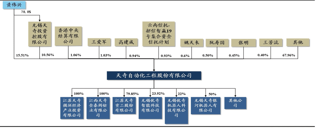 更值得一提的是,天奇股份结实的根基面还表现正在不变的股权布局和完美的子公司结构上,为计谋落地供给了保障。股权方面,公司股权布局相当安定,实控人黄伟兴间接持股15。51%,取其分歧步履人合计持股达27。0%;无锡天奇投资控股无限公司持股10。56%,此外还有六位天然人股东别离持股,焦点持股团队不变,避免了计谋扭捏的风险。